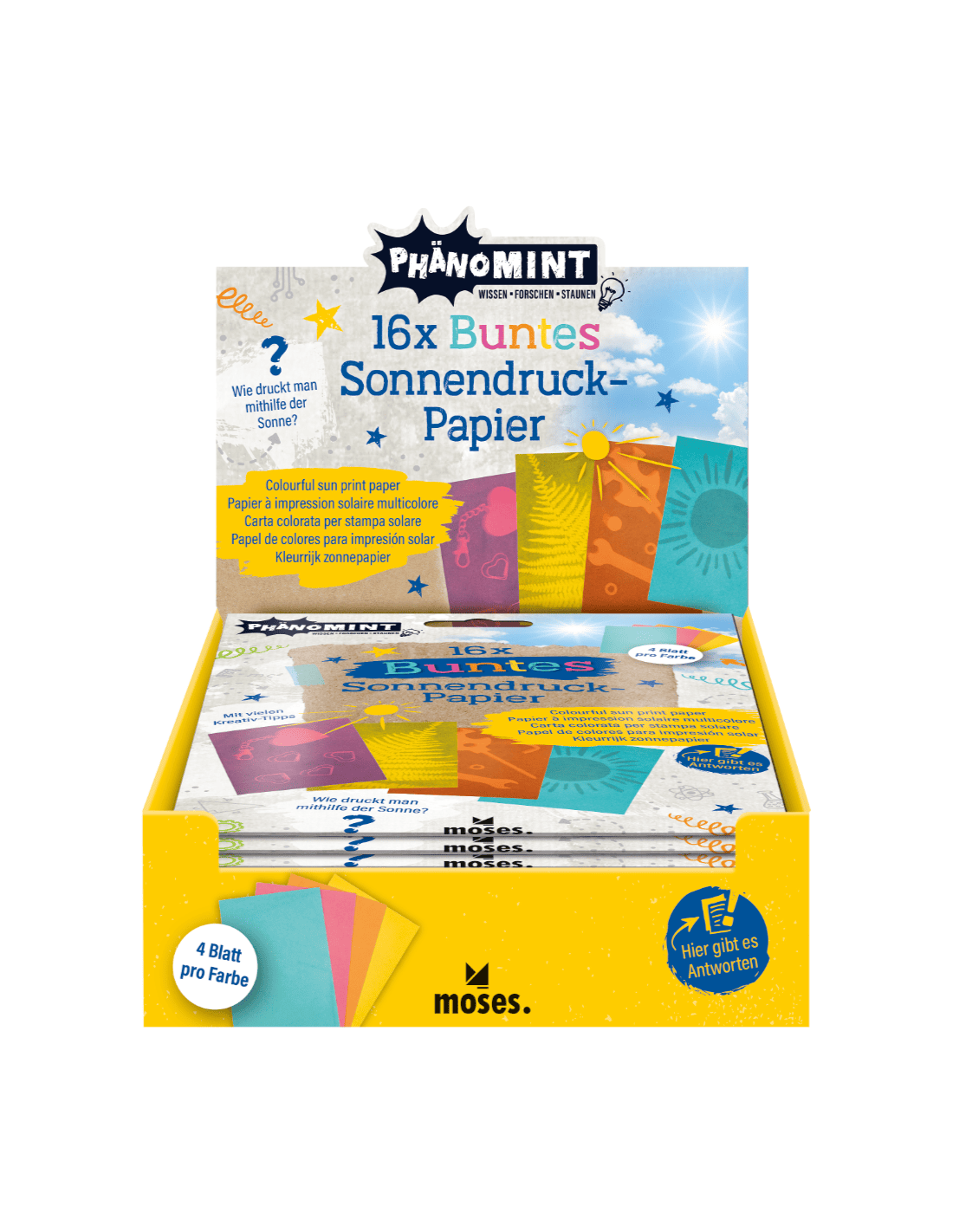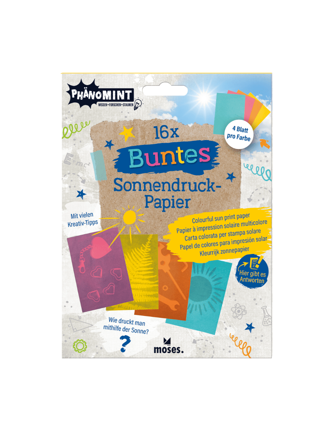 Juego de 16 papeles de diferentes colores para impresión solar. Marca Moses.
