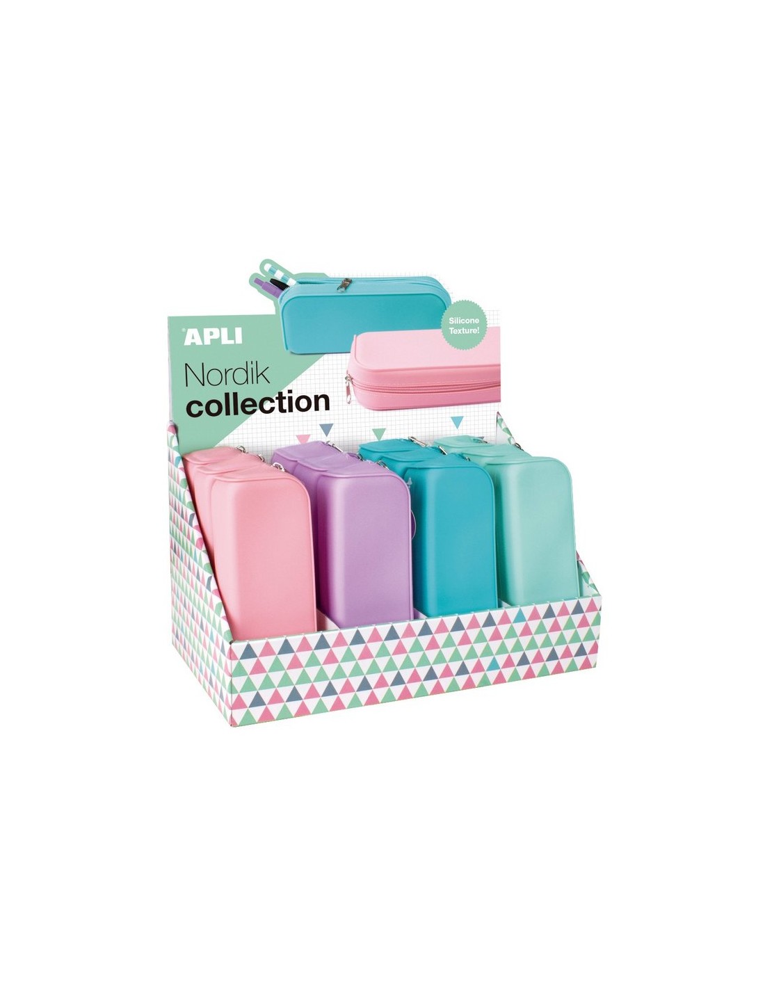 Estuche de silicona de tamaño 185 mm x 75 mm x 55 mm. 4 colores pastel a elegir* (rosa, violeta, azul y verde). Es funcional y minimalista, con cremallera, repelente al agua, fácil de limpiar y flexible. Serie Nordik. Marca Apli.