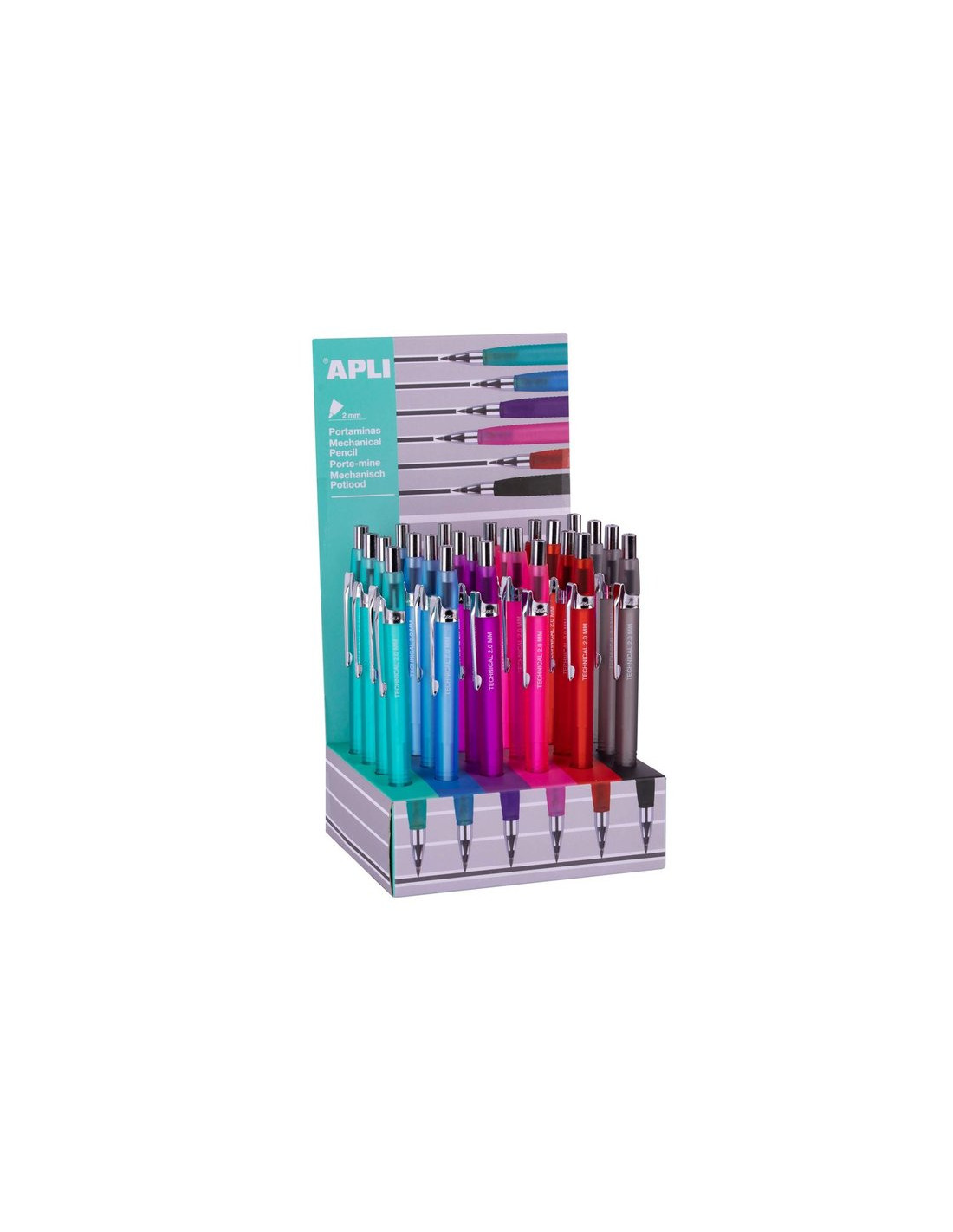 Portaminas con textura "soft" y clip metálico con minas extra-gruesas (como las de un lápiz convencional) de 2 mm. 5 colores disponibles* (azul, lila, fucsia, rojo y gris). Portaminas de plástico con forma triangular ergonómica y muy agradable al tacto, con capuchón metálico, goma de borrar y sacapuntas para afilar la mina. Marca Apli.