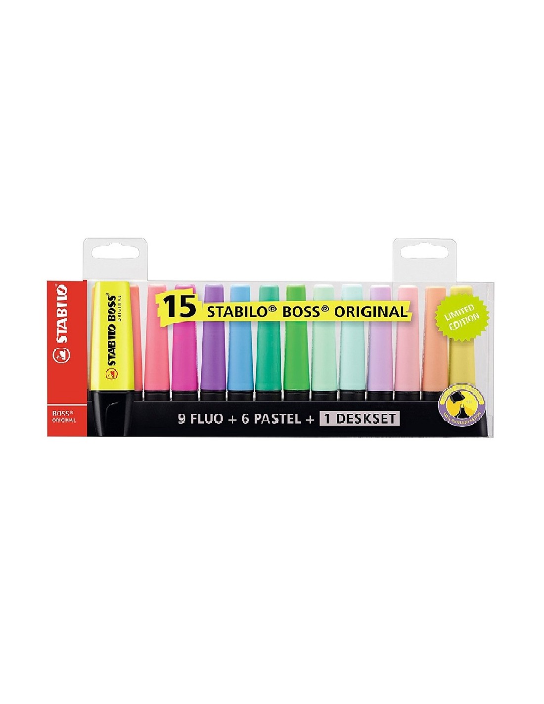 Set de 15 marcadores (9 fluorescentes + 6 pastel) y un soporte de escritorio. Protección anti secado. Ancho de trazo 2 mm + 5 mm. Soporte de escritorio y embalaje fabricados en plástico reciclado 100%. Marca Stabilo.