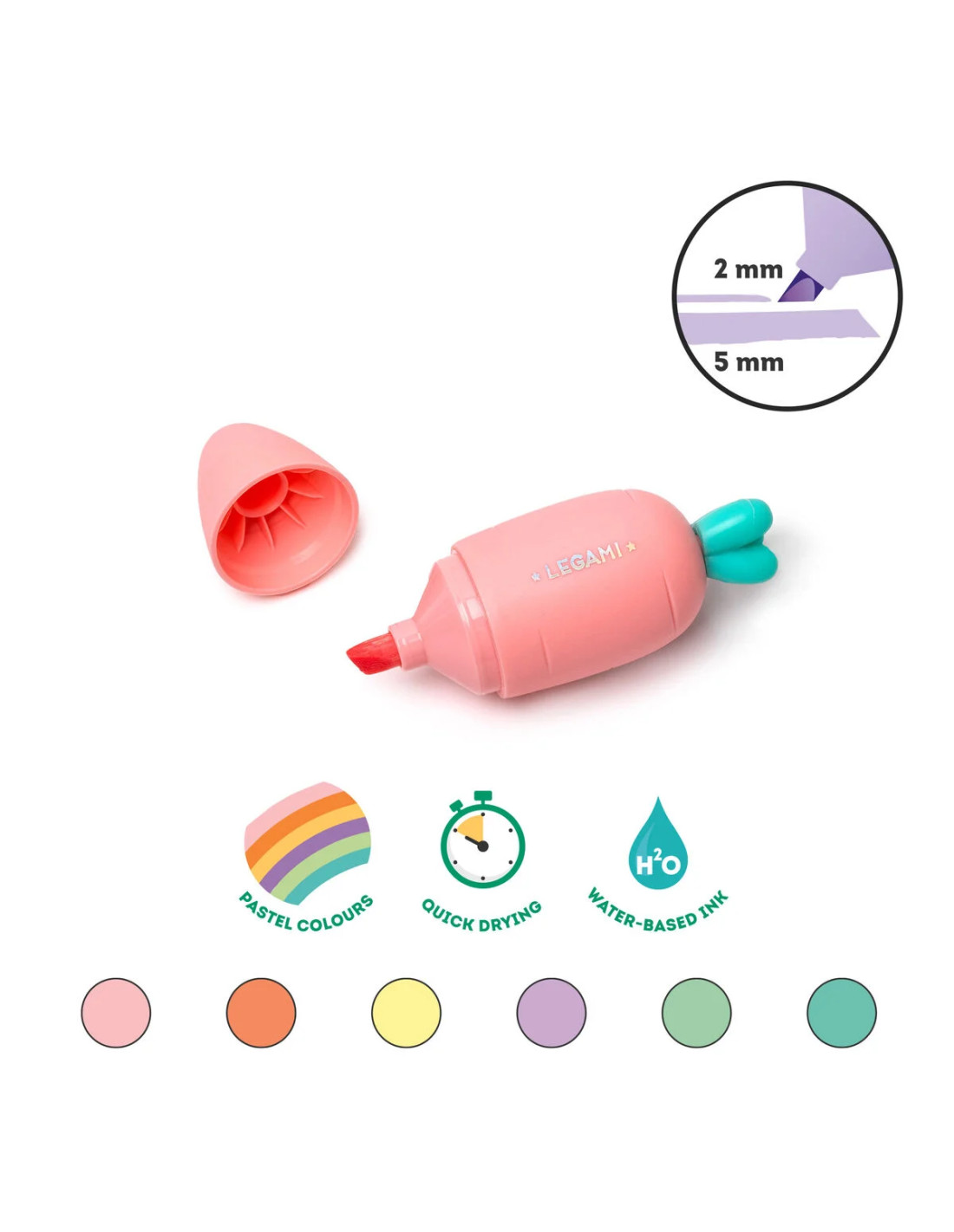 Este set de 6 mini subrayadores en forma de zanahoria dará color a tus libros y cuadernos gracias a sus brillantes tintas a base de agua. Pueden hacer tanto trazos finos como gruesos. Colores pastel: rosa, naranja, amarillo, morado, verde y celeste. Secado rápido. No apto para niños menores de 3 años por contener piezas pequeñas. Marca Legami.