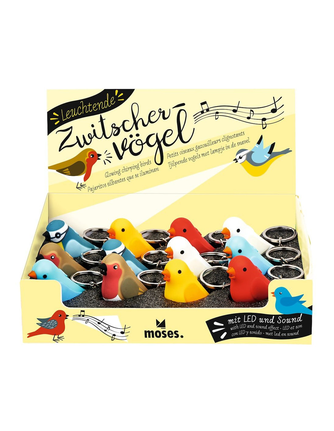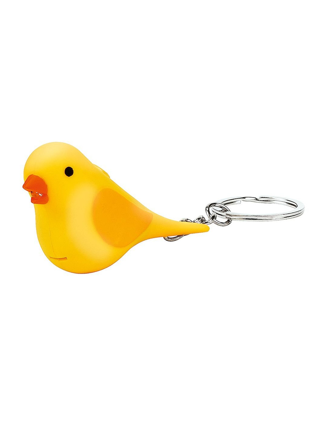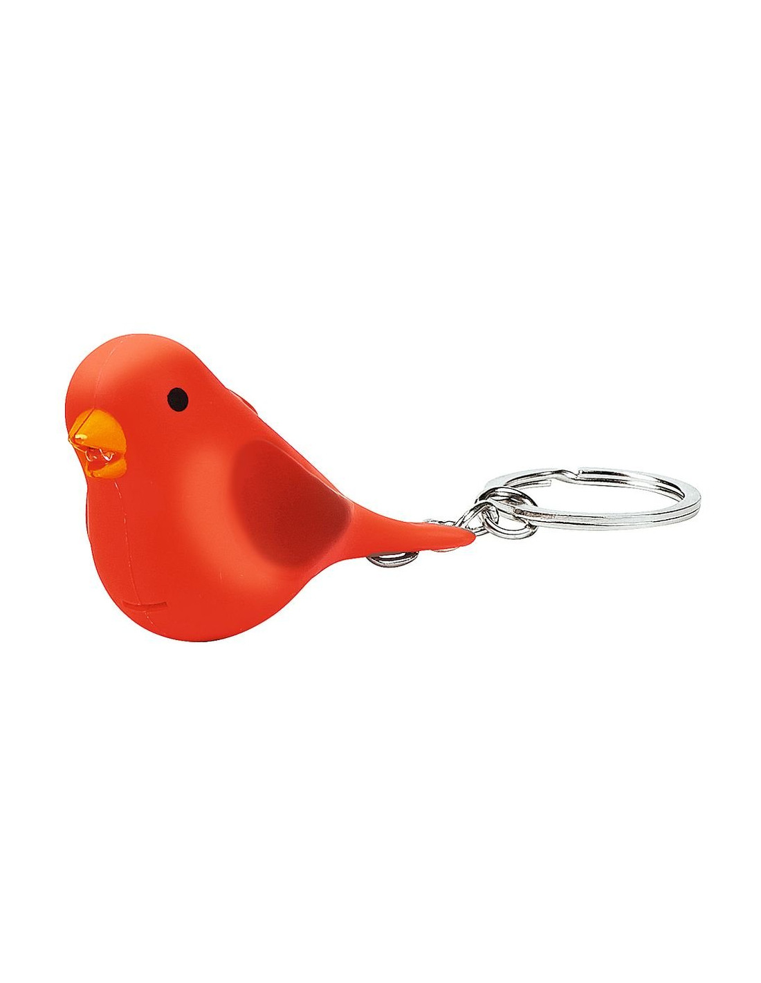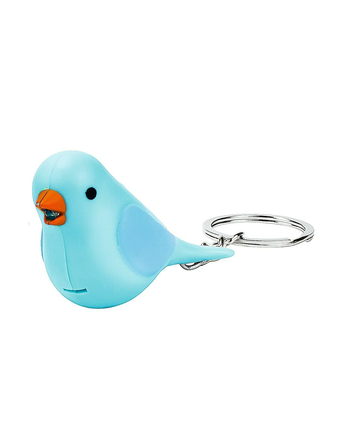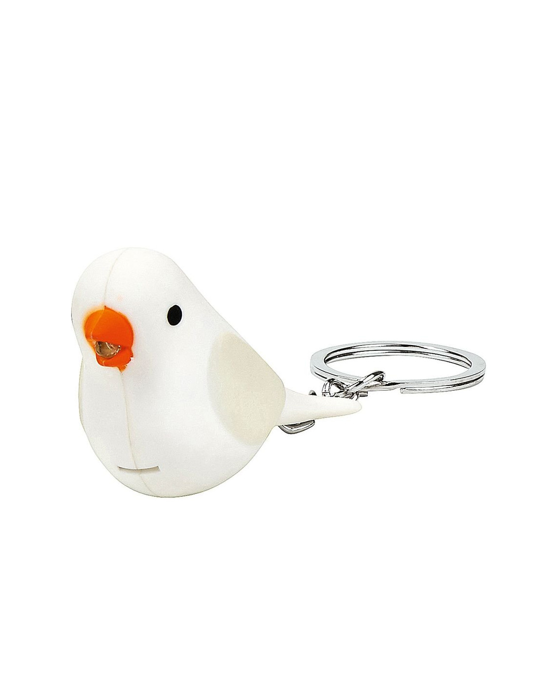 Llavero con forma de ave, luz led y sonido. Baterías incluidas reemplazables (3 x LR1130 = AG10). Medidas: 6,4 cm x 3,6 cm x 2,5 cm. 4 modelos diferentes* (canario, cardenal, colorín azul y diamante mandarín blanco) Marca Moses.