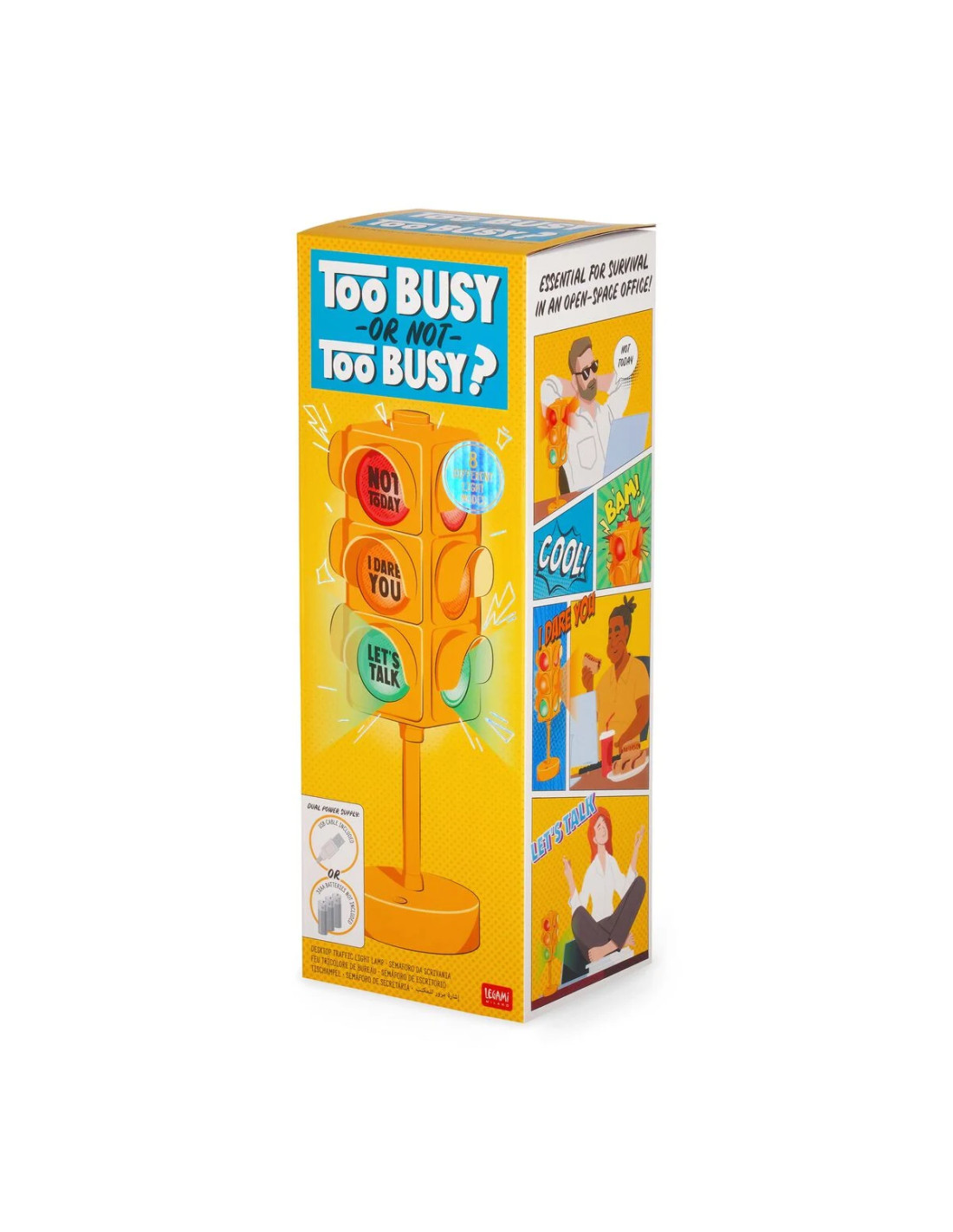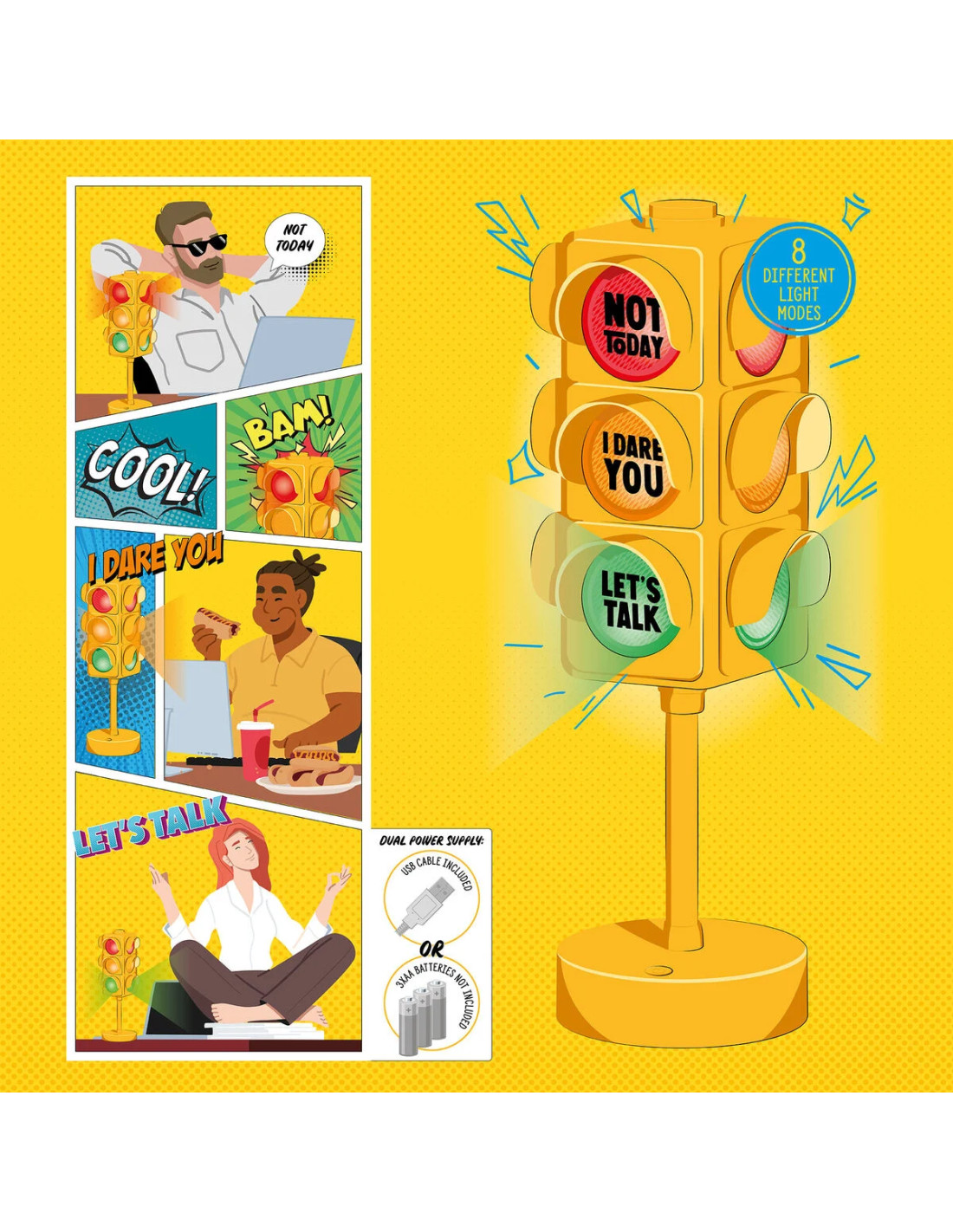 ¿Es buen momento para molestarte? Indícaselo a tus compañeros con este semáforo de escritorio. "Too busy or not too busy?". ¿Mucho follón? Cambia la luz led a rojo y nadie se atreverá a interrumpirte. ¿Tienes algo de tiempo para charlar? Pon el verde y que venga quien quiera. ¿Con trabajo pero puedes hacer una pequeña pausa? Entonces enciende el amarillo. ¡Todo listo para gestionar el tráfico de la oficina! Varias opciones de iluminación (fijo, intermitente, etc). Doble alimentación con pilas (no incluidas) o con cable USB (incluido). Material ABS. Altura 30 cm. Peso 294 g. Marca Legami.