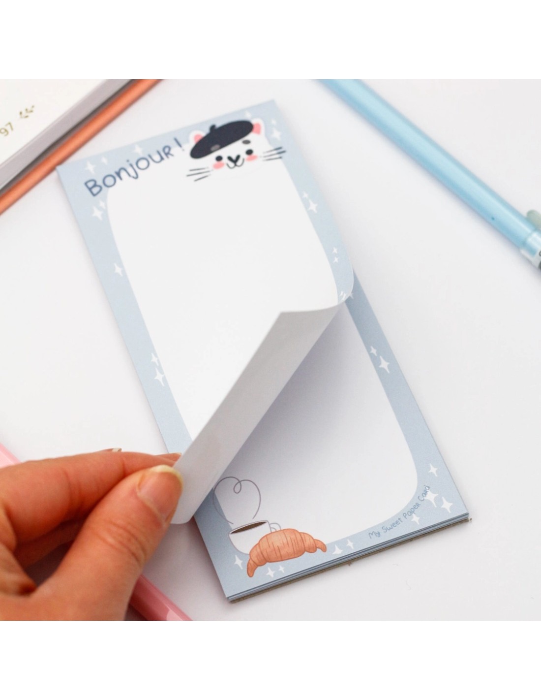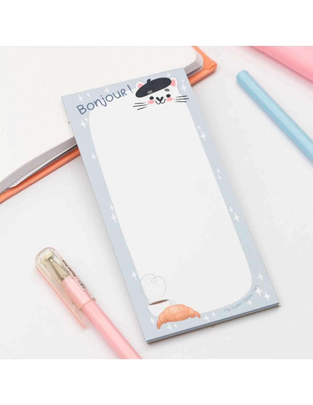 Bloc de notas ilustrado rectangular. Tamaño: 148 mm x 70 mm. 30 hojas pegadas. Cartón robusto en la parte trasera. Hecho en Francia. Marca My Sweet Paper Card.