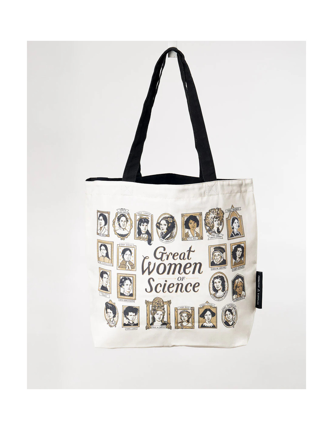 Bolso reversible de canvas 100% reciclado con ilustraciones de mujeres científicas en el exterior y negro con cremallera en el interior. Medidas 44 cm x 37 cm. Diseñado en EEUU. Marca Cognitive Surplus.