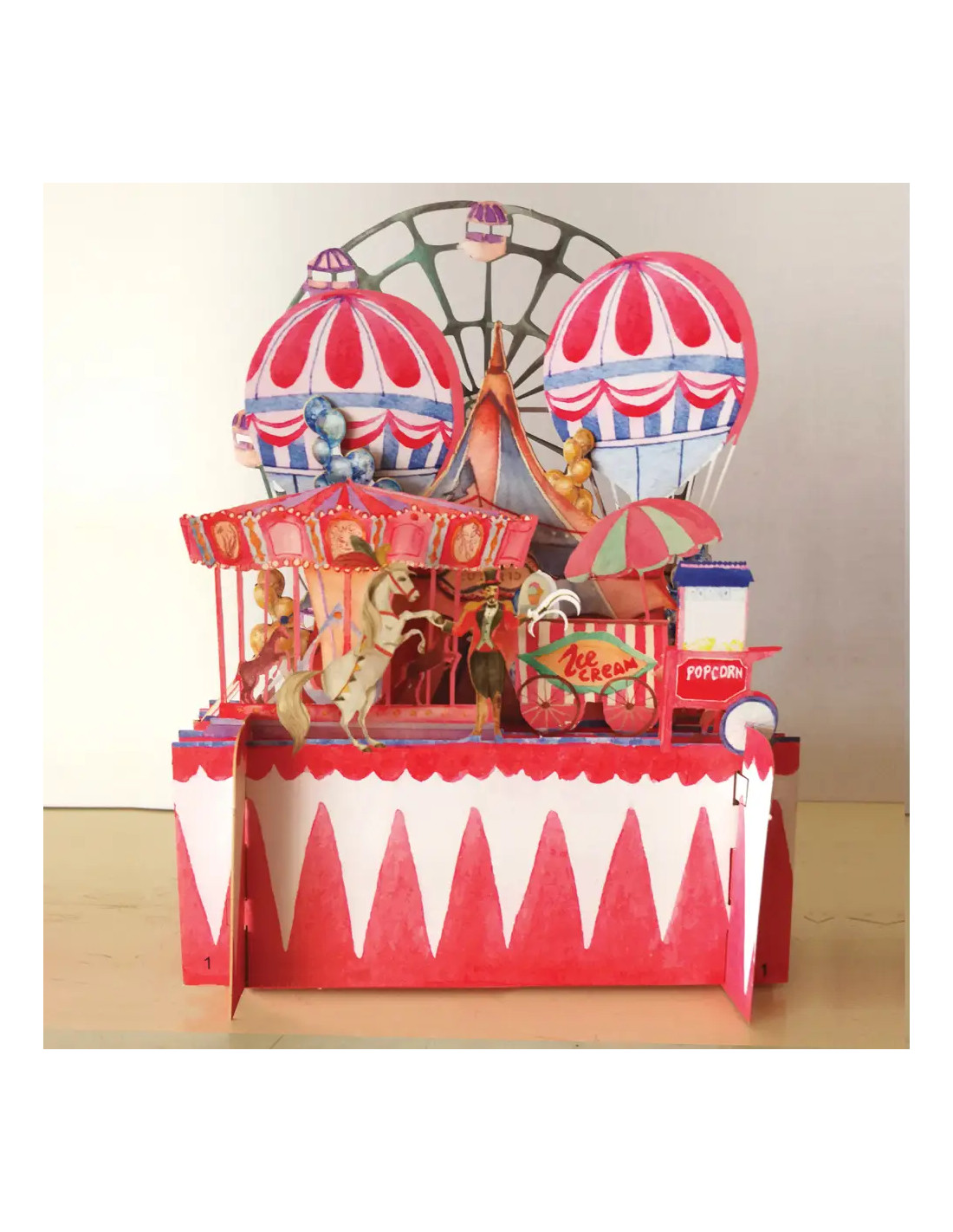 Tarjeta infantil desplegable en 3D. La escena representa una feria con todas las atracciones. Viene plana con un sobre. Tamaño: 155 mm x 155 mm. Puedes escribir tu mensaje en el reverso de la tarjeta. La tarjeta se despliega fácilmente para crear un aspecto tridimensional. Ideal para regalar y/o utilizar como decoración. Hecho en Irlanda. Artículo de ilustradora. Marca Alljoy Design.